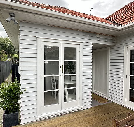 Vintage french doors were sourced (on a client's budget) from Demolition Traders, and lovingly installed in a prime, North-West facing position of this Hamilton East home. The client is overjoyed how the french doors open up the home to capture the afternoon sun, and create a greater feeling of living space, while retaining the character of the property.