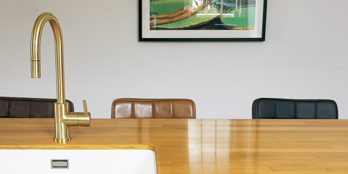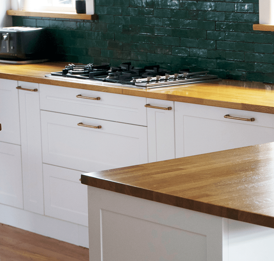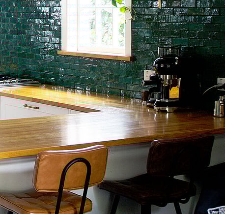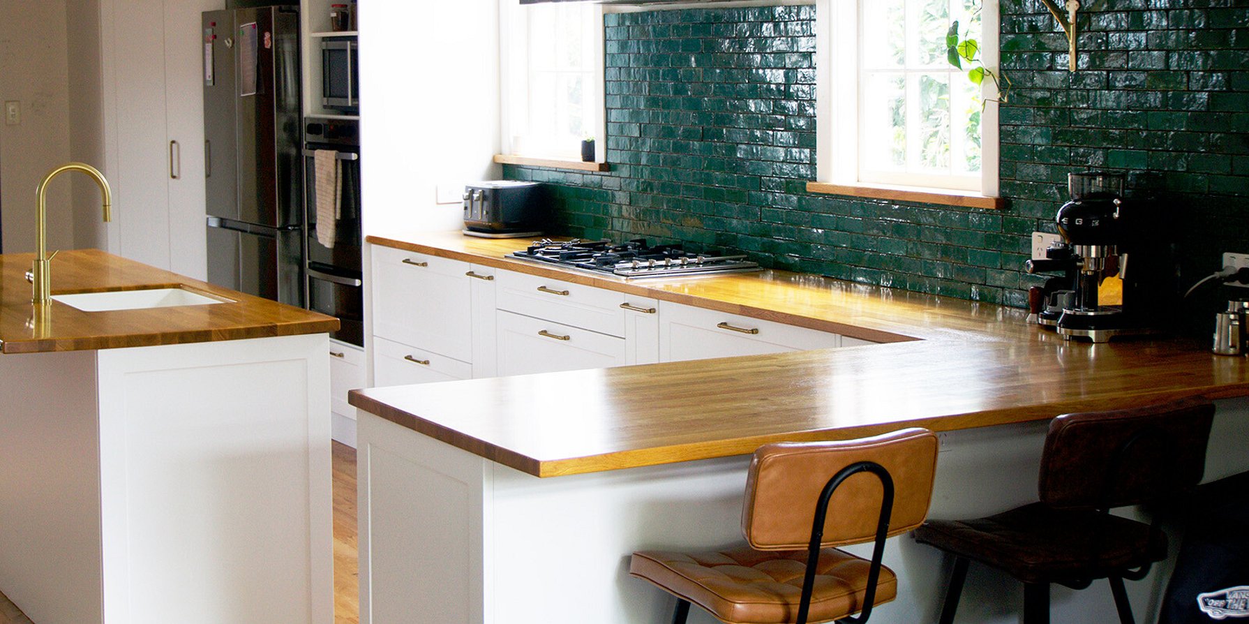 We stripped the old tired kitchen out which was tucked right at the back of the house, opened up the wall between the kitchen and lounge and repositioned the new L-shaped breakfast bar to sit nicely between the lounge and kitchen bringing the two spaces together and creating an entertainers dream. We used a finger-jointed oak bench top to compliment the shaker style cabinetry and beautiful forest green handmade Moroccan tiles to bring everything to life.